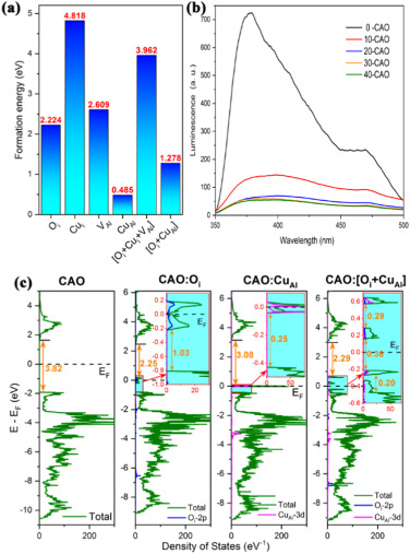 图4、(a)CuAlO2不同本征点缺陷及其复合物的形成能,(b)所制备的CuAlO2样品的PL光谱,(c)含有不同本征缺陷的CuAlO2的态密度对比。