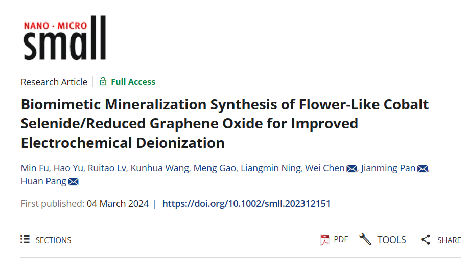 近日,来自山东HTH官网地址 大学的付民、清华大学的吕瑞涛、江苏大学的潘建明与扬州大学庞欢合作,采用简便的仿生矿化合成策略构筑了花状硒化钴(CoSe2)/石墨烯异质结构(Bio-CoSe2/rGO)。花状结构牢固的锚定在石墨烯片层上,不仅增强了结构稳定性,而且改善了导电性,从而加速了离子传输和电荷迁移。良好的结构特性赋予了电极材料更好的电化学表现,所合成的Bio-CoSe2/rGO复合电极材料表现出优异的除盐性能(在1.2 V和300 mg L-1 NaCl溶液中,最大除盐量为56.3 mg g-1,最大除盐速率为5.6 mg g-1 min-1,60圈循环后保持率为92.5%)。吸附动力学研究表明,Bio-CoSe2/rGO除盐电极的电容去离子行为更符合准二级动力学模型,其对钠离子的吸附由可逆的化学作用所主导。 该工作不仅丰富和拓展了仿生矿化合成策略的应用领域,而且为高性能电容去离子电极材料的设计提供了新的思路。研究成果以题为“Biomimetic mineralization synthesis of flower-like cobalt selenide/reduced graphene oxide for improved electrochemical deionization”发表在国际知名期刊Small上。