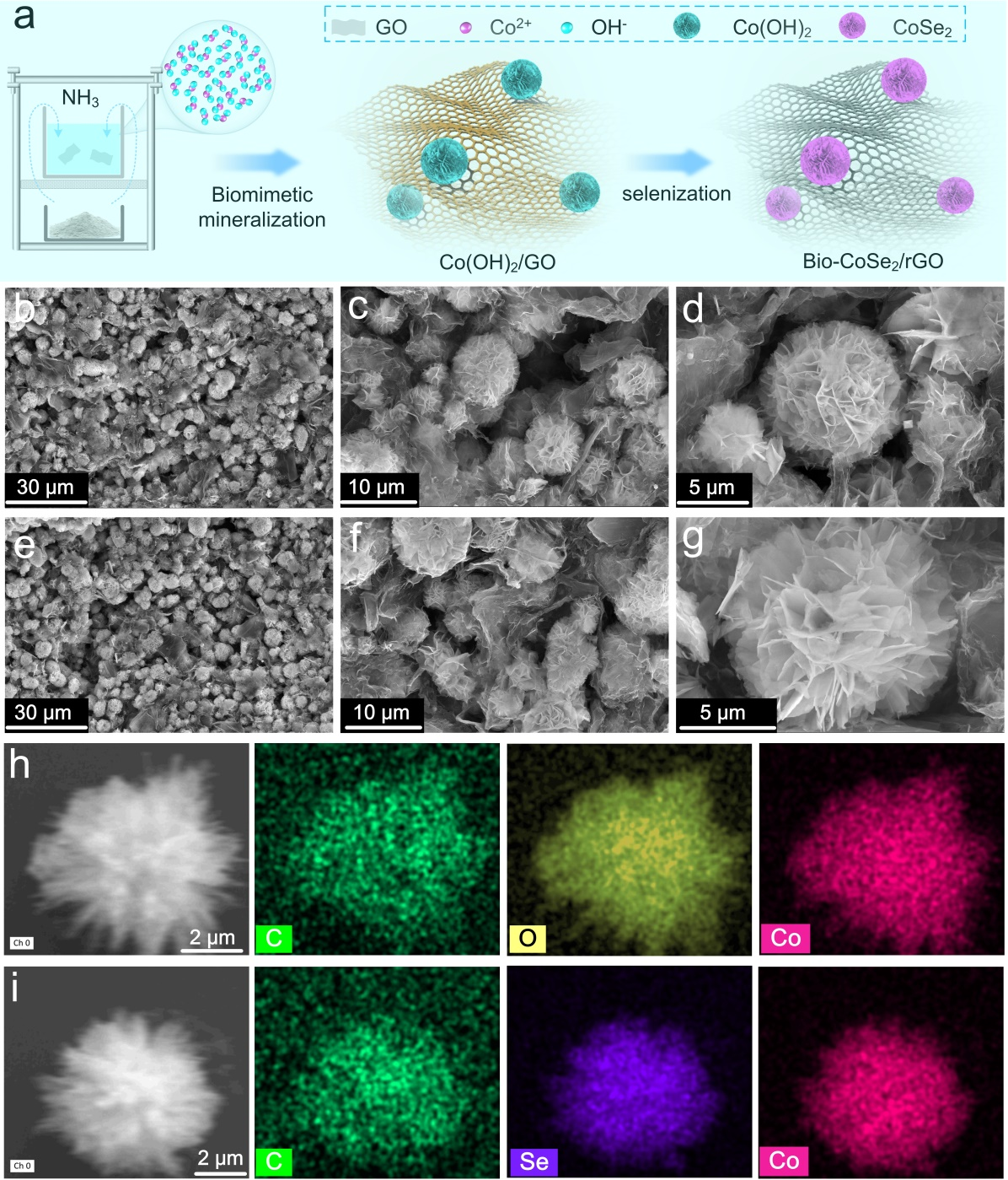 图1. Bio-CoSe2/rGO复合材料的仿生矿化合成示意图(a)及形貌表征,(b,c,d,h) Co(OH)2/GO,(e,f,g,i) Bio-CoSe2/rGO。