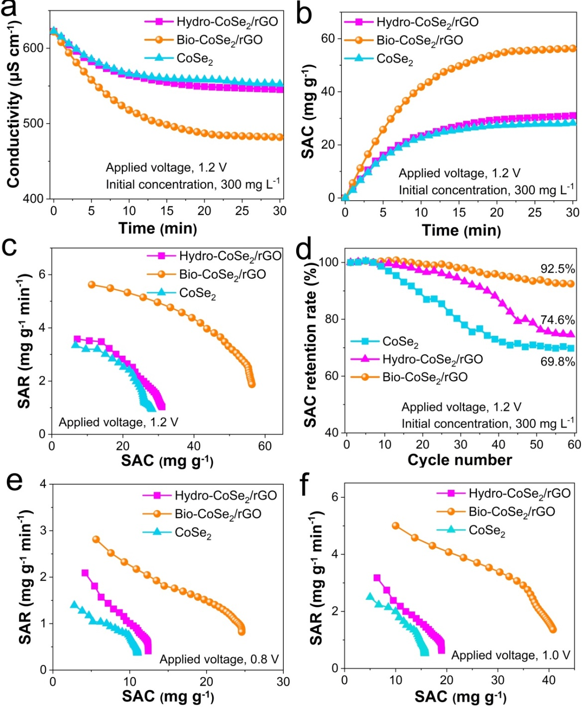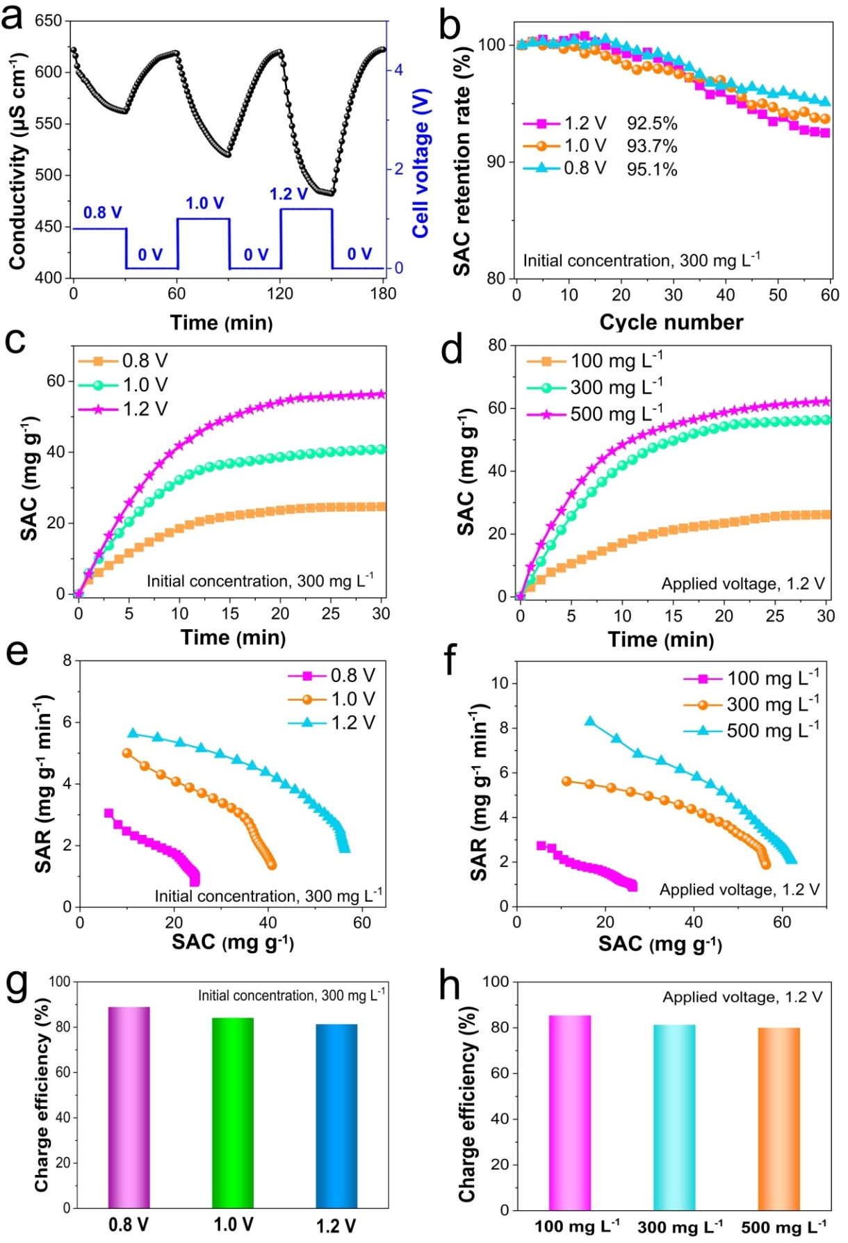 图4. Bio-CoSe2/rGO电极不同电压或不同盐浓度下的电容去离子性能。