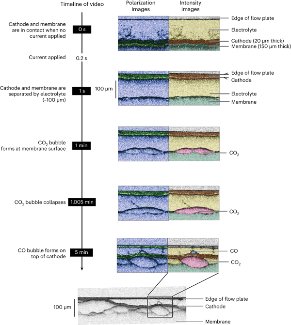 图3 eOCT显示的CO2电解器中离散的CO2和CO气泡生成的极化和强度图像 © 2024 Springer Nature