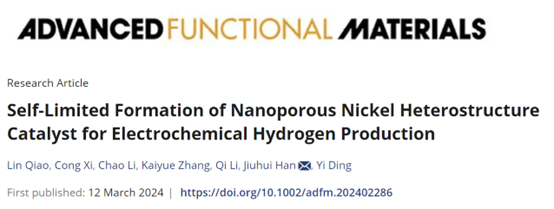 Lin Qiao, Cong Xi, Chao Li, Kaiyue Zhang, Qi Li, Jiuhui Han, Yi Ding. Self-Limited Formation of Nanoporous Nickel Heterostructure Catalyst for Electrochemical Hydrogen Production. Advanced Functional Materials 2024, 2402286.