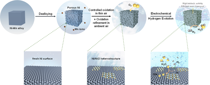 电解水制氢是实现绿色电能消纳同时提高可再生能源利用效率的有效途径。其中,高性能电极材料的研发是突破电解水制氢技术瓶颈的关键。在众多非贵金属中,过渡金属Ni被认为是最具潜力的碱水电解制氢催化剂之一。然而,纯金属Ni催化活性较差,并且纳米Ni在空气中易自燃的安全性问题极大限制其进一步应用。