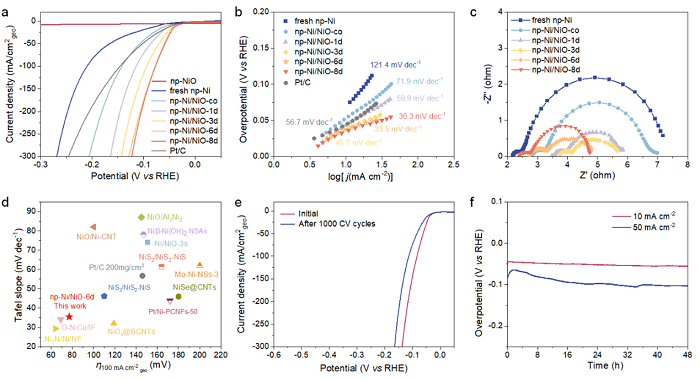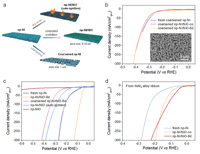 (d) 以NiAl3为前驱体制备的np-Ni及自限氧化后np-Ni/NiO电极的HER极化曲线