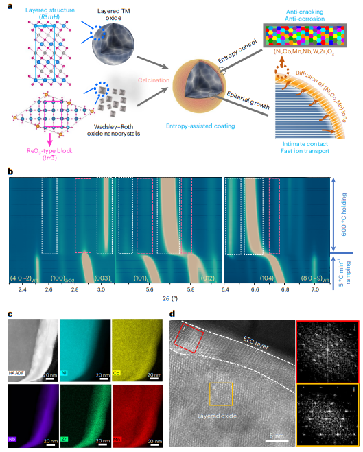 该项成果开发了一种具有强电化学机械电阻的通用外延熵辅助涂层策略,有助于解决超高镍NCM正极在快速充电和长期循环过程中的应变传播问题。这种外延熵辅助的表面不仅有效地增强了超高Ni正极在极端操作条件下的结构稳定性,而且促进了Li+的传输,以确保快速(脱)锂氧化还原动力学,避免了循环稳定性和能量/功率密度之间的权衡困境。本工作期望这种外延熵辅助的包覆策略将为高功率锂离子电池的设计和开发开辟表面工程机会。