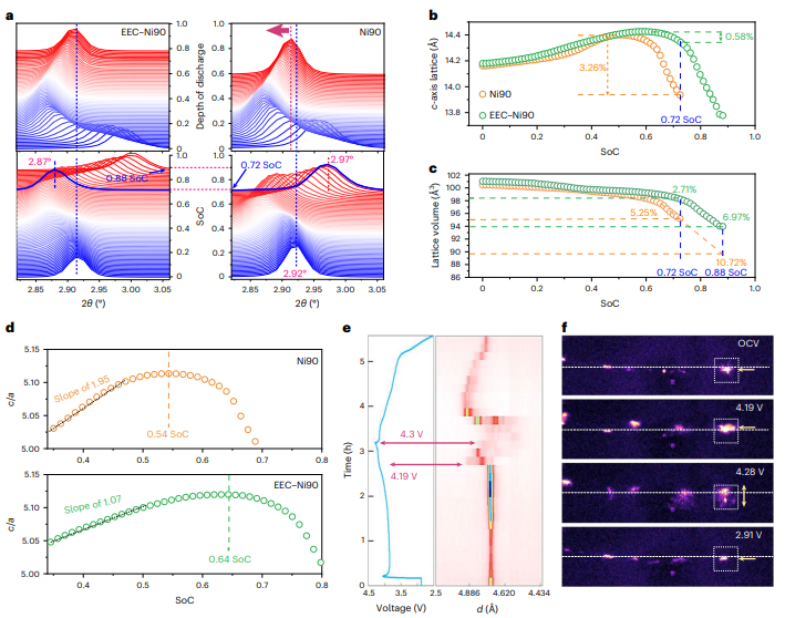 接下来,本工作进行了体相和局部相结构稳定性表征。采用原位HEXRD跟踪Ni90和EEC-Ni90正极在充电/放电过程中的相转变。如图3a所示,由于O-O库仑排斥作用的减弱,Ni90只能提供0.72的最大SoC,并伴随着严重的晶格收缩,表现为(003)峰从2.92°急剧移动到2.97°。作为对比,在相同的SoC(0.72)下,EEC-Ni90仍处于平滑的晶格膨胀阶段,显示出更强的氧稳定性,因此在相同的截止电压(4.3 V)下,获得了更高的最大SoC(0.88) (图3a)。然而,尽管EEC-Ni90具有更高的SoC,但与Ni90相比,EEC-Ni90表现出更好的结构可逆性,表现为放电后Ni90正极的峰位偏移更大,而EEC-Ni90正极的(003)峰几乎可以恢复到原来的位置。