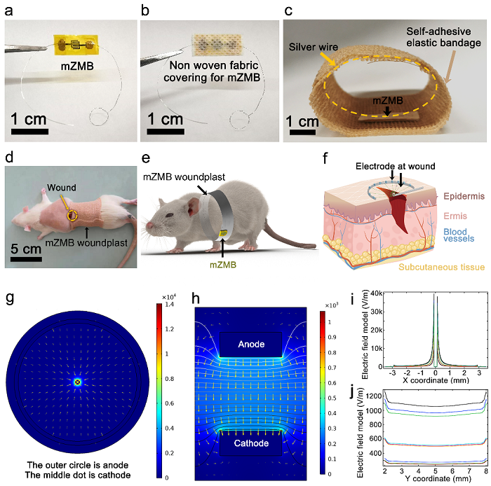 图2 a. mZMB 的照片。b. 贴附在医用无纺布胶带上的mZMB的照片。c-e. 自粘弹力绷带缠绕在 mZMB 上构成给小鼠使用的 mZMB电愈贴。f. 由环形电极 mZMB 伤口塑料产生的外源电场驱动的小鼠伤口愈合机制。g-j. COMSOL 模拟 mZMB 伤口塑料的两种电极(环形、平行)形状产生的电场分布。
