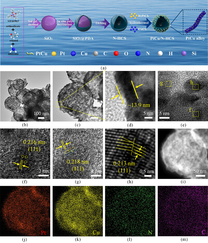 图 1 (a) PtCu/N-HCS 催化剂的制备示意图;(b-d)Pt0.38Cu0.62/N-HCS的TEM图及其(f)点缺陷、(g)线缺陷(边缘位错)和(h)平面缺陷(小角度晶界);(i-m)Pt0.38Cu0.62/N-HCS的HAADF-STEM图像和元素mapping图。