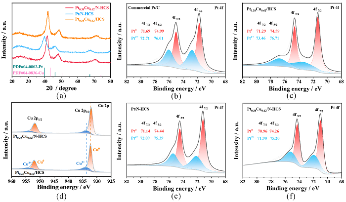 图2 (a) Pt0.38Cu0.62/N-HCS、Pt/N-HCS、Pt0.38Cu0.62/HCS催化剂 的XRD谱图;(b, c, e, f)商业Pt/C、Pt0.38Cu0.62/N-HCS、Pt/N-HCS 和Pt0.38Cu0.62/HCS催化剂的Pt 4f XPS谱图;(d)Pt0.38Cu0.62/N-HCS、Pt0.38Cu0.62/HCS催化剂的Cu 2p XPS谱图。