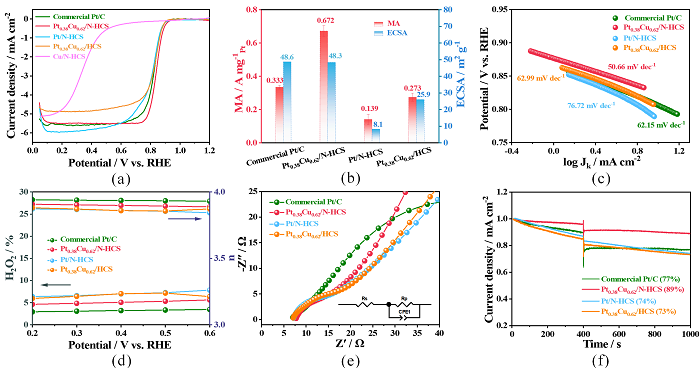图3 (a) 商业 Pt/C、Pt0.38Cu0.62/N-HCS、Pt/N-HCS 和 Pt0.38Cu0.62/HCS 催化剂在0.1 M HClO4溶液中的LSV曲线、 (b)质量活性(MA) 和 ECSA、(c)Tafel 图、(d) 电子转移数和 H2O2 产率、(e) 电化学阻抗谱和(f) 抗甲醇渗透性能。