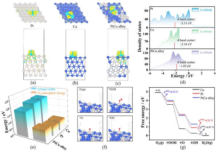 图4 (a)Pt(111)、(b)Cu(111)和(c)PtCu(111)晶面上O2的电荷密度差分图,其中黄色和蓝绿色区域分别表示电子的积累和耗尽;(d) Cu (111)、Pt (111) 和 PtCu (111) d 带中心的 PDOS图;(e) Cu (111)、Pt (111) 和 PtCu (111) d 带中心与 O2 吸附能的相关性; (f) 在PtCu (111) 上各吸附中间体(*OOH、*O、*OH)能量最优的氧还原反应路径;(g) 电极电位为零时,Cu (111)、Pt (111) 和 PtCu (111) 上发生氧还原反应时吉布斯自由能变化图。