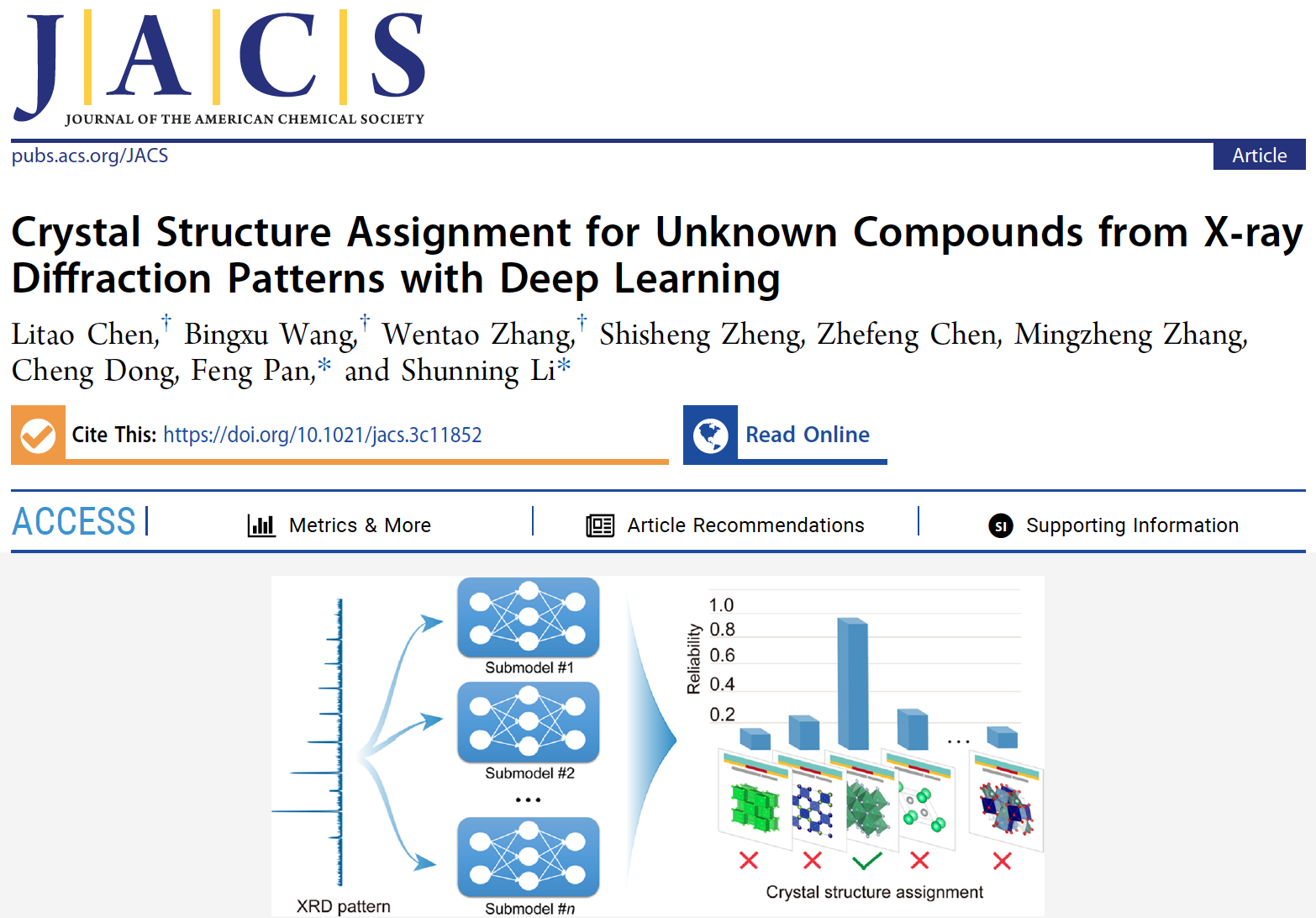 近日,北京大学深圳研究生院新材料学院潘锋/李舜宁团队基于所构建的材料数据库,设计了一个基于残差神经网络的深度学习模型CrySTINet。该模型能够从实验表征得到的XRD数据中准确识别出未知材料的结构类型,为自动化XRD分析提供了新的途径。相关研究成果以“Crystal Structure Assignment for Unknown Compounds from X‑ray Diffraction Patterns with Deep Learning”为题,发表于《Journal of the American Chemical Society》(J. Am. Chem. Soc. 2024, DOI: 10.1021/jacs.3c11852)。