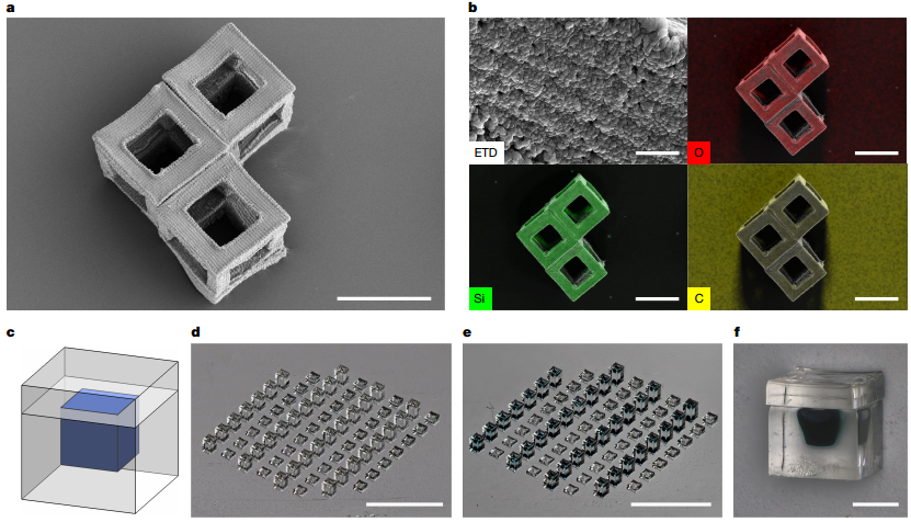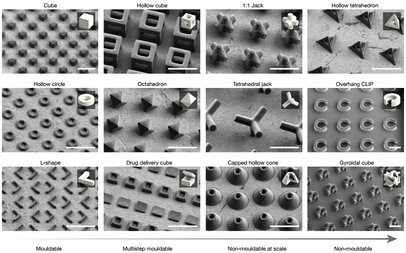 图3 r2rCLIP制造的可模塑和不可模塑形状的SEM图像(比例尺,250µm)