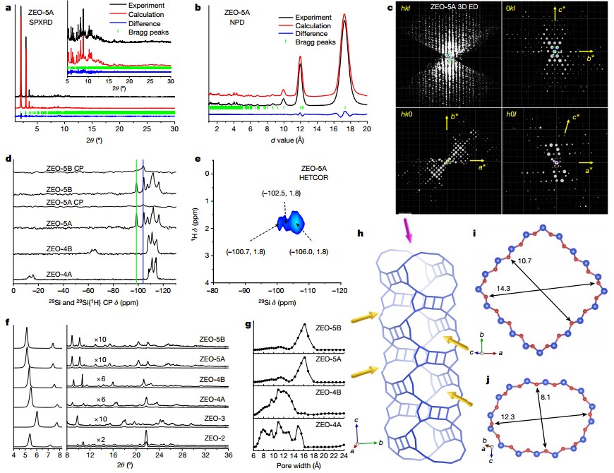 南京大学黎建、华东师范大学吴鹏、吉林大学于吉红、西班牙马德里材料研究所的Miguel A. Camblor等研究者在本文中报道了一种策略,该策略通过用插入硅烷化剂分离和连接一维硅酸盐链,使其膨胀产生热稳定性和水热稳定性,获得了特定结晶方向的超大孔沸石材料。该团队所制备的间链扩展沸石含有悬空的Si–CH3基团,这些基团通过煅烧相互连接,从而形成真正的、完全连接的(除了可能的缺陷)三维沸石骨架,密度非常低,并且具有以前在任何类型的沸石中都没有的三重四环单元。