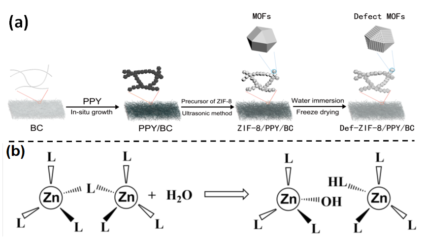 图1 (a) Def-ZIF-8/PPY/BC复合材料制备工艺示意图;(b) ZIF-8与水分子相互作用导致缺陷形成的示意图。(L: 2-甲基咪唑有机配体)。