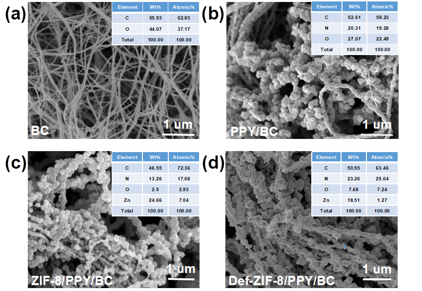 图2各样品SEM图像与EDX结果:(a)BC;(b)PPY/BC;(c)ZIF-8/PPY/BC;(d)Def-ZIF-8/PPY/BC。