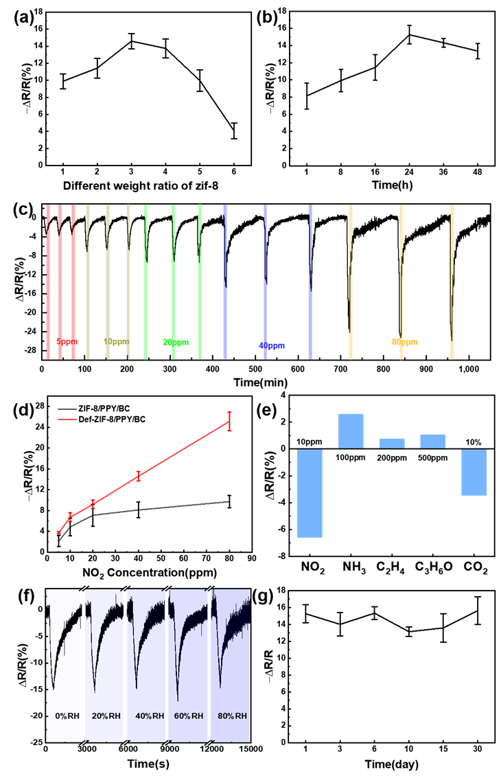 图3 (a)不同ZIF-8负载下Def-ZIF-8/PPY/BC基柔性传感器对40 ppm NO2的响应强度;(b)不同水处理时间(1-48h)下,Def-ZIF-8/PPY/BC基柔性传感器对40 ppm NO2的响应强度;(c)Def-ZIF-8/PPY/BC基柔性传感器室温下对不同NO2浓度(5-80 ppm)的实时电阻响应曲线;(d) ZIF-8/PPY/BC和Def-ZIF-8/PPY/BC基柔性传感器室温下对不同NO2浓度(5-80 ppm)的响应强度比较;(e) Def-ZIF-8/PPY/BC基柔性传感器对各种气体(10 ppm NO2、100 ppm NH3、200 ppm C2H4、500 ppm丙酮、10% CO2)的选择性;(f)不同湿度背景(0-80%)下,Def-ZIF-8/PPY/BC基柔性传感器对40 ppm NO2的实时响应曲线变化;(g) Def-ZIF-8/PPY/BC基柔性传感器对40 ppm NO2长期稳定性响应强度测试。