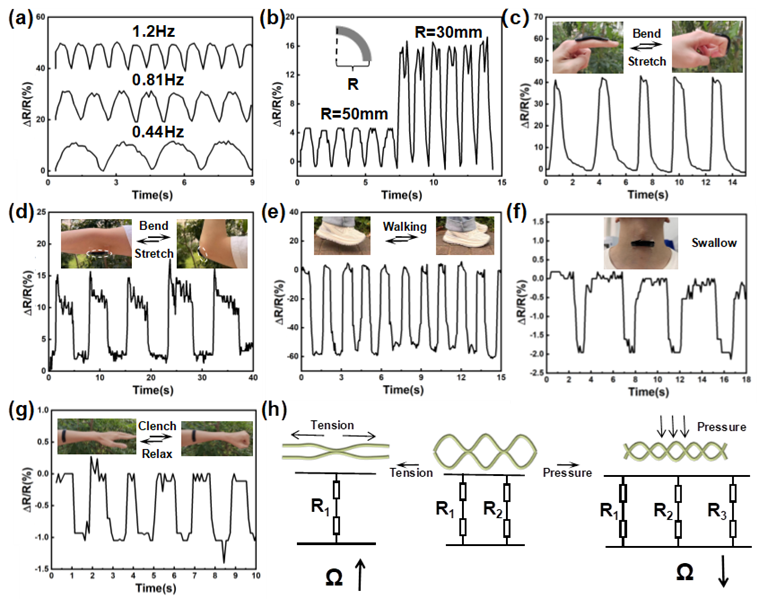 图4 Def-ZIF-8/PPY/BC基柔性传感器应力应变传感性能评估:(a)不同弯曲频率(0.44 Hz, 0.81 Hz, 1.2 Hz)下的实时响应曲线;(b)不同弯曲半径(30mm、50mm)下的实时响应曲线;(c)手指重复弯曲的实时响应曲线;(d)重复性手臂弯曲的实时响应曲线;(e)行走行为实时响应曲线;(f)吞咽行为实时响应曲线;(g)手臂肌肉形变实时响应曲线;(h) Def-ZIF-8/PPY/BC基柔性传感器应力应变传感机理示意图。