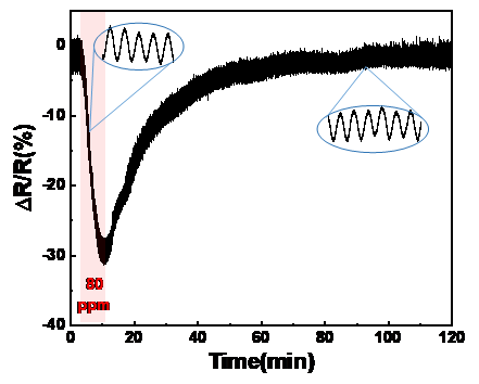 图5 Def-ZIF-8/PPY/ BC基柔性传感器在周期性弯曲应力(频率1.2 Hz,半径50 mm)下对80ppm NO2的实时响应曲线 (附图为周期性应力变化下的实时响应曲线)。