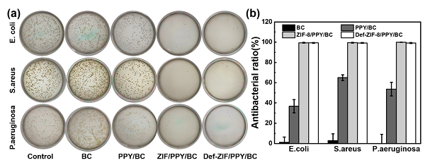 图6 BC、PPY/BC、ZIF-8/PPY/BC和Def-ZIF-8/PPY/BC传感材料抗菌效果评估:(a)不同样品上生长大肠杆菌、金黄色葡萄球菌和铜绿假单胞菌的代表性图片;(b)大肠杆菌、金黄色葡萄球菌和铜绿假单胞菌在不同样品上的抗菌率。