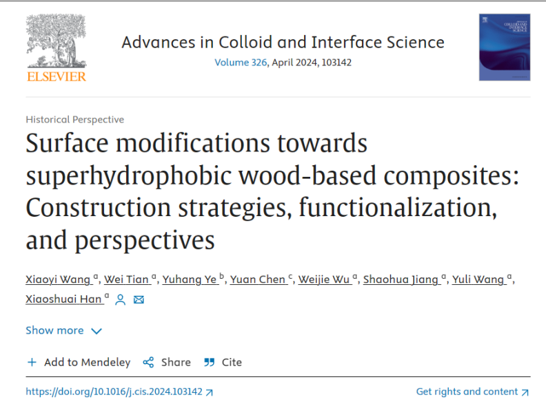 该研究以“Surface modifications towards superhydrophobic wood-based composites: Construction strategies, functionalization, and perspectives”为题发表于Advances in Colloid and Interface Science南京林业大学材料科学与工程学院硕士研究生王小艺为第一作者,韩小帅副教授为通讯作者。