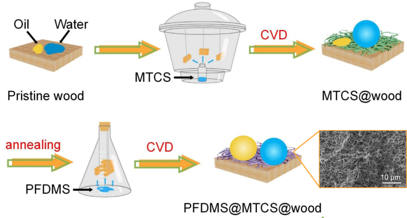 图2 CVD法制备MTCS@wood 和 PFDMS@MTCS@wood 的示意图。