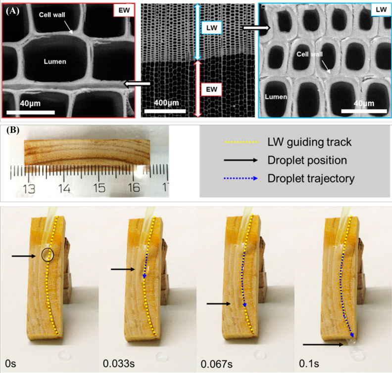 图3 (A)由旋转切片机切割获得的原生云杉木材截面的SEM图像。(B) 10 μL液滴在改性LW上的运动。木材样品倾斜(44°)。
