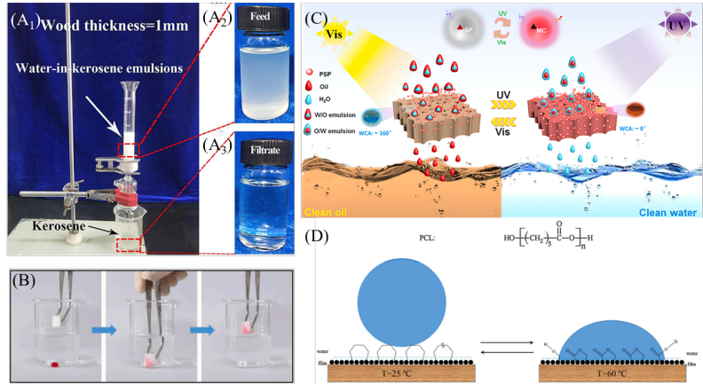 图6 (A1) 利用超疏水木片在重力驱动下分离水包煤油乳液的光学照片。(A2) 水包煤油乳液分离前的光学图像。(A3) 水包煤油乳液分离后的光学图像。 (B) 利用 M-WA 从水中吸收氯仿的过程照片。 (C) 三维智能 BW/PSP 膜的功能示意图。 (D) 热响应PCL10,000 膜的拟议机理示意图。