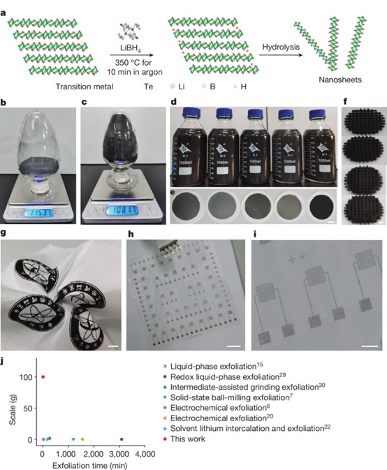 本文开发出一种通用的固体锂化和剥离方法,用于百克高质量TMT纳米片的合成,可能彻底改变其商业生产,这种方法为大规模生产它们的纳米片开辟了可能性。此外,这些纳米片具有优异的可加工性,可以形成各种油墨,用于制造膜、薄膜、纳米复合材料和异质结构,并结合先进的(微)制造技术,这将加速基础研究,并允许它们在许多研究领域的应用,包括但不限于拓扑电子学、催化、能量存储和柔性电子学。