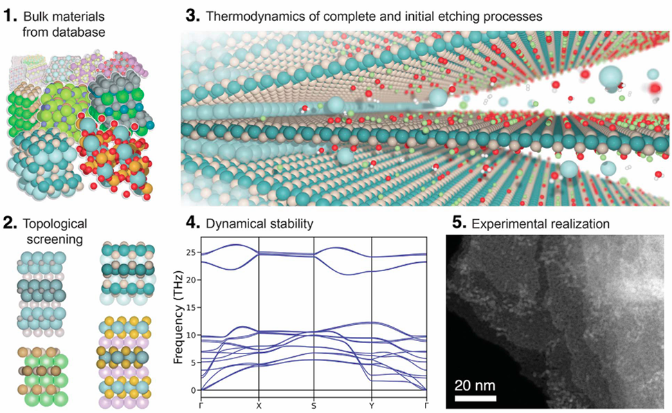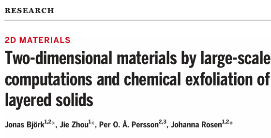 已有将石墨剥离成石墨烯的成功案例,因此科学家希望可以有类似石墨烯材料的合成,例如二维材料。化学剥离二维材料是一种将多层二维材料分离为单层的方法。二维材料具有特殊的物理和化学性质,因此对其进行剥离并获得单层材料对于研究其性质和开发应用具有重要意义。化学剥离通常涉及在适当的溶剂中处理多层材料,以使其层间相互作用减弱,然后通过机械或化学方法将单层材料分离出来。虽然机械剥离是一种有效的制备方法,但是需要具有特定结构的前驱体材料,但是不太适用于大规模生产。为解决该难题,林雪平大学Johanna Rosen、Jonas Björk和Jie Zhou等人开始尝试利用计算模拟来预测适合化学剥离的材料。提出了一种理论方法,通过识别适合选择性蚀刻的 3D 材料来预测酸性条件下化学剥离形成的 2D 材料。从 66,643 种 3D 材料的数据集中,在多个材料系列中确定了 119 种可能可剥离的候选材料。为了证实该方法,选择了一种在结构和化学成分上与MAX相明显不同的材料进行实验验证。