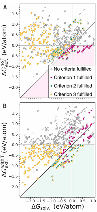 图1为计算筛选方法的示意图。该方法包括(i)从热力学稳定的三元数据集开始;(ii) 拓扑筛选,这些前体由二维单元组成,通过单种原子层化学的三维前驱体元素);(iii) 计算剥离、溶解过程和初始蚀刻步骤的热力学原理;以及 (iv)计算衍生材料的动力学稳定性。方法从根本上不同于机械剥离,与机械剥离预测有本质区别。该方法还有助于了解化学剥离过程中的热力学和动力学特性,为二维材料的合成和应用提供了理论指导。