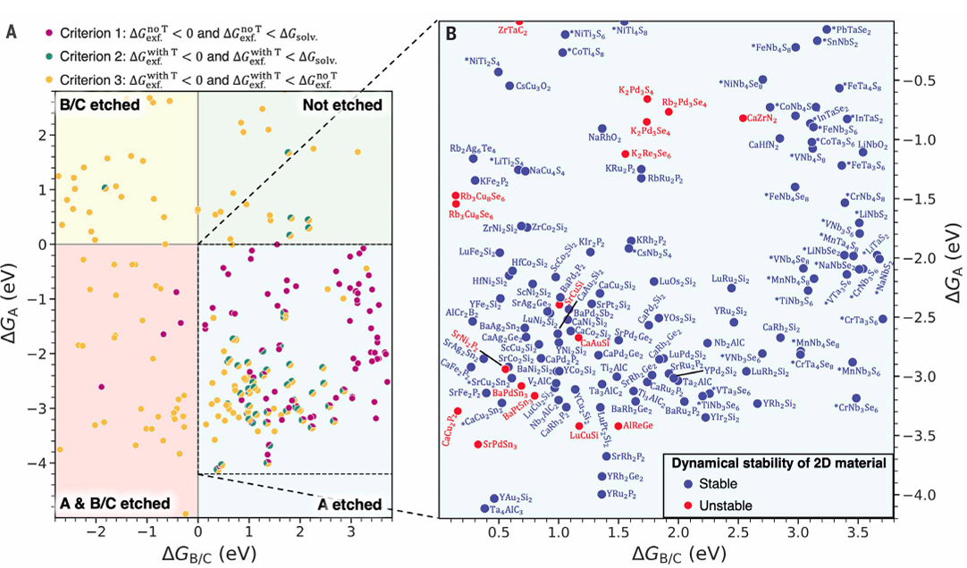 1.提出了一个计算筛选算法用于识别可以在酸性条件下通过选择性蚀刻原子层而化学剥离成二维材料的分层三维化合物。