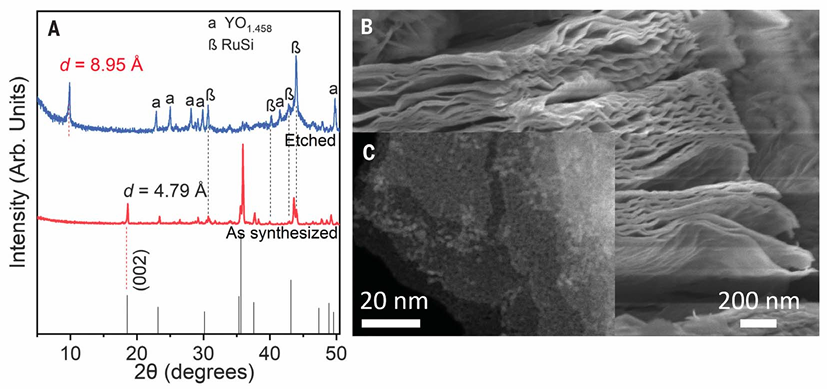 实验验证图4表征了YRu2Si2在水性HF溶液中的化学剥离过程。在图4A中表征了蚀刻前(红色曲线)和蚀刻后(蓝色曲线)的X射线衍射(XRD)图谱。从图中可以看出,经过HF处理后,YRu2Si2的峰强度显著减小,蚀刻过程导致了材料结构变化。此外,观察到(002)峰的位置发生了向较低角度的移动,这表明了晶格的扩展,符合材料从三维到二维的转变。图4B的扫描电子显微镜(SEM)图像,可以清楚地看到,粉末颗粒呈现出剥离的特征,具有手风琴状的形态,这是典型的二维材料的特征。进一步证实了材料在化学剥离过程中发生了层状结构的形成。图4C是的透射电子显微镜(STEM)图像,表征了少层Ru2SixOy的形态,材料呈现出层状的结构,并且片之间有明显的分离,这进一步证明了YRu2Si2在HF溶液中的化学剥离过程形成了二维材料。
