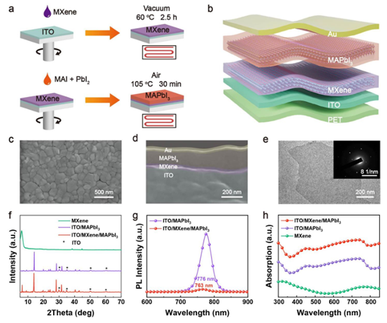 图1. (a)自供电钙钛矿光电探测器中MXene和MAPbI3层的制备过程;(b)器件结构示意图;(c) MAPbI3层的SEM俯视图;(d)器件的SEM截面图;(e) Ti3C2Tx纳米片的TEM图像;(f) MXene、ITO/MXene、ITO/MXene/MAPbI3的XRD谱图;(g) MAPbI3、MXene/MAPbI3的PL谱图;(h) ITO/MXene/MAPbI3、ITO/MAPbI3和MXene的紫外–可见吸收光谱。©Wiley