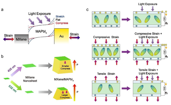 图5阐述了压电光电子效应和热释电光电子效应的协同作用机制。施加应变改变了MAPbI3的压电极化,从而影响了热释光电子电流。MXene层对MAPbI3层的光热膨胀产生限制作用,增强其压电极化,进而增强热释电光电子效应。压缩应变增强了热释电光电子效应,而拉伸应变减弱了热释电光电子效应。图5证实了压电光电效子应可以通过改变压电极化来调节热释电光电子效应,为利用压电效应设计高性能光电探测器提供了理论基础。