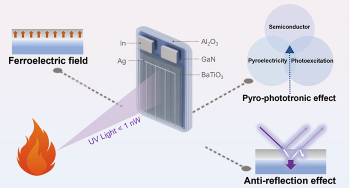 图1.通过耦合铁电计划场、减反射效应和热释光电子效应耦合增强自驱动紫外光电探测器用于火焰探测的示意图。