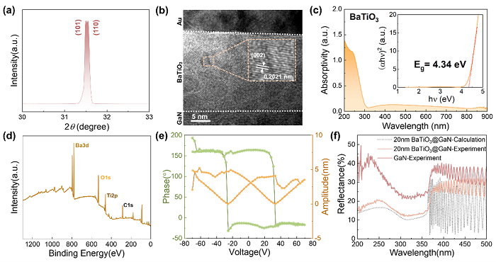 图2. BaTiO3薄膜的制备和表征。(a)GaN衬底上生长的BaTiO3薄膜的部分放大XRD图;(b)GaN衬底上生长的BaTiO3薄膜横截面的HRTEM图像,插图为四方相晶粒的放大图;(c)在非晶SiO2衬底上生长的BaTiO3薄膜的吸收光谱,插图为通过Tauc Plot方法得到的(ahn)2-hn关系曲线;(d)BaTiO3薄膜的XPS谱;(e)GaN衬底上生长的BaTiO3薄膜的相位/幅度-电压函数图;(f)GaN/BaTiO3薄膜表面反射率的实验值和拟合值。