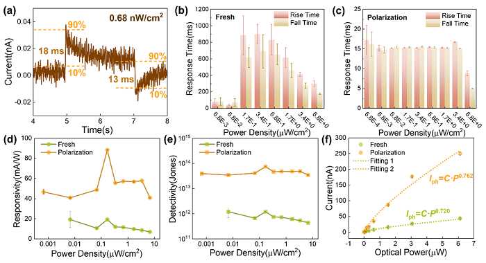 图4. 器件的光电响应性能分析。(a)0.68 nW/cm2入射光下,器件单个光电信号的脉冲时间响应分析;器件在(b)fresh状态和(c)polarization状态下的响应回复时间;器件在fresh状态和polarization状态下的(d)响应度、(e)比探测率和(f)光电流峰值与光功率的关系。