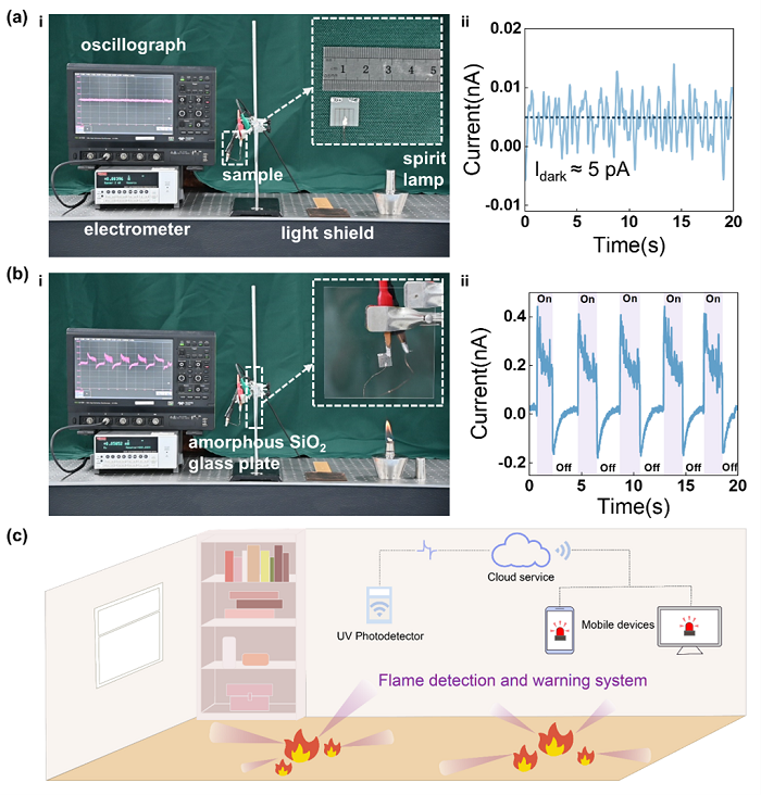 图6. 器件在火焰探测中的应用。(a)i 应用演示中使用的实验设备,插图为器件的光学图像;ii 暗态条件下器件的暗电流数据;(b)i 点燃的酒精灯向器件表面发射紫外线,插图显示了器件前面用于阻挡热量的非晶SiO2玻璃板;ii 火焰探测装置获得的光电信号;(c)火焰探测和报警系统示意图。