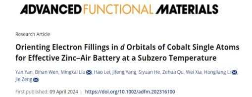 近日,安徽工业大学化学与化工学院多相催化团队与中国科学技术大学合作,通过调控钴单原子d轨道电子的空间分布,开发出一种在零度以下有效运行的锌-空电池。相关成果以“Orienting Electron Fillings in d Orbitals of Cobalt Single Atoms for Effective Zinc–Air Battery at a Subzero Temperature”为题发表在《Advanced Functional Materials》上,论文的第一作者是安徽工业大学化学与化工学院的闫岩教授,共同通讯作者是安徽工业大学刘明凯教授、曾杰教授,以及中国科学技术大学李洪良副教授。安徽工业大学为论文的第一完成单位。