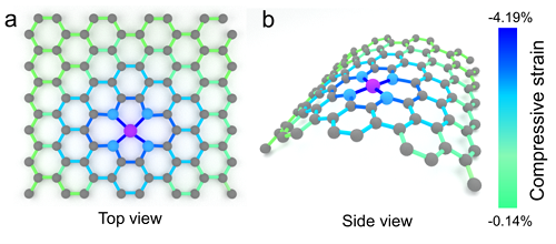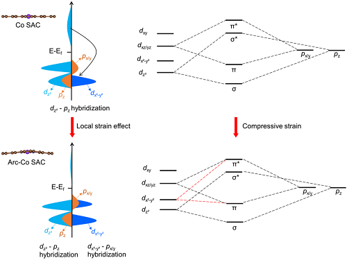 安徽工业大学化学与化工学院多相催化团队开发了一种受压缩应力的钴单原子催化剂,其不仅能增强ORR反应活性,还能作为空气电极在零度下促进锌-空气电池的充放电。研究团队在具有极小曲率半径(约2 nm)的高度弧形碳层上负载钴单原子(Arc-Co-SAC)来产生压缩应变,这种局域压缩应力诱导钴单原子d轨道不同空间取向的电子发生了重新分布,径向(xy平面)电子填充数增加,从而增强了其与活性中间体分子的有效电子轨道重叠程度,提高了ORR的活性(图1)。