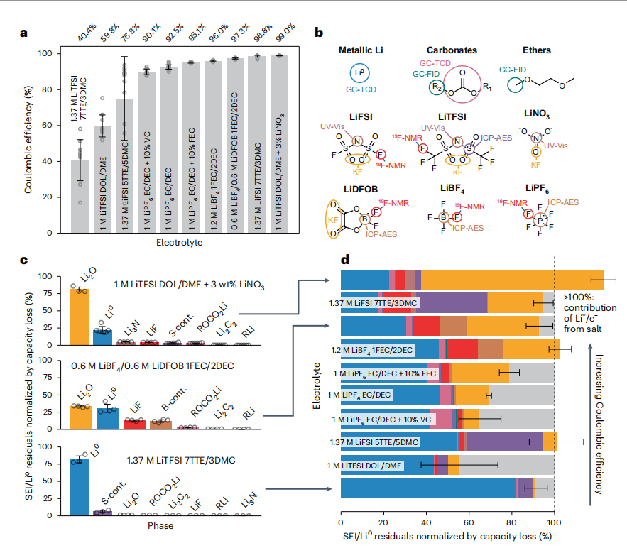 图1(a)不同电解液的库仑效率。(b)不同电解液中的溶剂物种和盐的示例。(c)不同电解液中SEI/Li0残留物的归一化测量值。(d)不同电解液中SEI/Li0残留物归一化测量值的累积表示。© 2023 Springer Nature