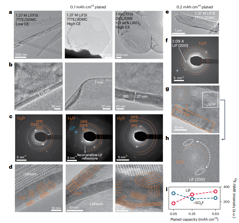 图2(a)电解液中电镀锂沉积形态的低倍率图像。(b)放大的界面图像。(c)接近界面的选区电子衍射(SAED)测量。(d)SEI内晶体结构的HRTEM图像。(e)在1.37M LiFSI 7TTE/3DMC LHCE电解液中的锂沉积的低倍率图像。(f)SEI的SAED。(g)SEI中的晶体相的HRTEM图像。(h)所示白色区域的傅里叶变换。(i)镀锂电极中-SO2F和LiF的19F-NMR测量。© 2023 Springer Nature