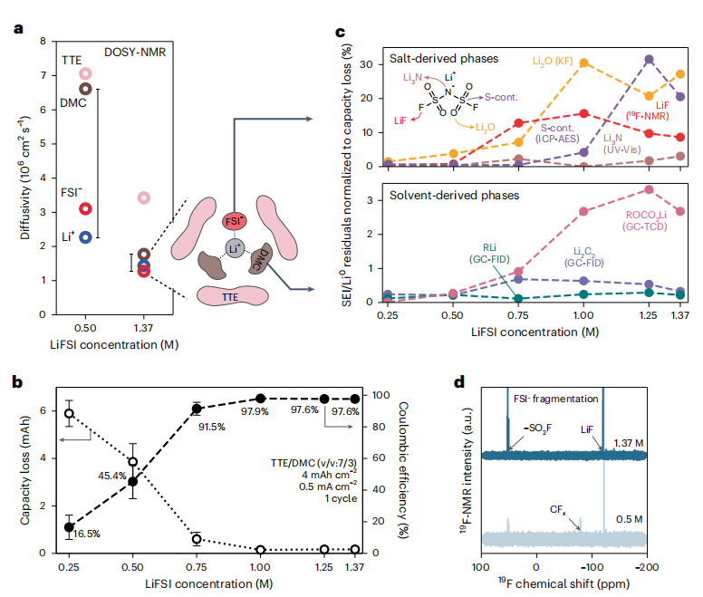图3(a)0.5 M和1.37 M LiFSI TTE/ DMC中所有电解液成分的扩散性,揭示了DMC-Li+-FSI−配位壳层的形成。(b)在LiFSI 7TTE/3DMC(TTE/DMC (v/v:7/3))电解液中,随着盐浓度从0.5 M增加到1.37 M,第一周期容量损失和库伦效率。(c)盐衍生SEI相和溶剂衍生SEI相的量。(d)在0.5 M和1.37 M电解液中,电极残留物溶解在H2O后的19F-NMR。© 2023 Springer Nature