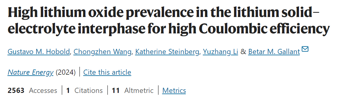 原文详情:Hobold, G.M., Wang, C., Steinberg, K. et al. High lithium oxide prevalence in the lithium solid–electrolyte interphase for high Coulombic efficiency. Nat Energy (2024). https://doi.org/10.1038/s41560-024-01494-x