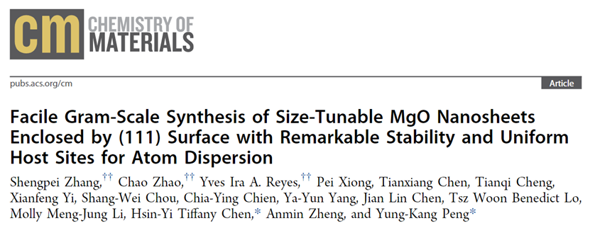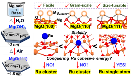 近日,香港城市大学化学系彭咏康教授课题组在Chemistry of Materials上发表了题为“Facile Gram-Scale Synthesis of Size-Tunable MgO Nanosheets Enclosed by (111) Surface with Remarkable Stability and Uniform Host Sites for Atom Dispersion”的研究论文(DOI: 10.1021/acs.chemmater.3c03018)。研究发现了一种更为简便,能大规模合成大小可控MgO(111)纳米片的方法,并详细探讨了不同MgO晶面对于单原子负载的影响,且实现了在MgO(111)表面上负载均一化学环境且稳定分散的Ru单原子。此工作有望在拓展均一单原子基底材料的选择方面提供进一步的指导。