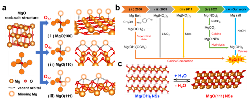 Scheme 1. (a) MgO不同表面示意图: (ⅰ) (100), (ⅱ) (110), (ⅲ) (111). (b) MgO (111) 合成流程比较. (c) Mg(OH)2和MgO(111)拓扑转换示意图.