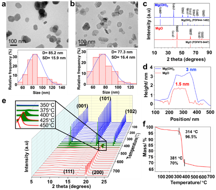 图1. (a) Mg(OH)2 (摩尔比OH–/Mg2+= 4)和对应(b) MgO纳米片的TEM图及粒径统计. (c) PXRD (d) AFM 表征(e) 原位SXRD (f) TGA 测试.