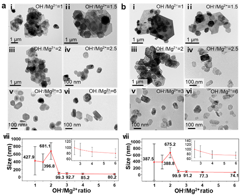 研究人员通过调控不同的OH–/Mg2+摩尔比例(1-6)和碱度(NaOH and NH4OH)成功合成了粒径范围为80 nm-1 μm的Mg(OH)2和MgO 纳米片。