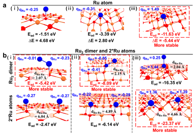 图3. DFT计算(a) Ru和(b) Ru二聚体吸附在MgO不同晶面上的吸附构型,吸附能和Bader电荷。